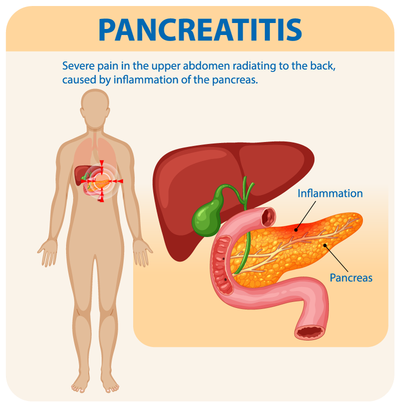 Pancreatitis is the inflammation of the pancreas, a gland located behind the stomach that helps in digestion and regulates blood sugar. This condition occurs when digestive enzymes inside the pancreas become active too early, irritating and damaging the pancreatic tissue. It can be acute (sudden and severe) or chronic (long-lasting and recurring). Common causes include gallstones, heavy alcohol consumption, certain medications, high triglyceride levels, or abdominal injury. Symptoms often include severe upper abdominal pain, nausea, vomiting, fever, and a rapid pulse. If left untreated, pancreatitis can lead to serious complications like infection, tissue damage, or diabetes.